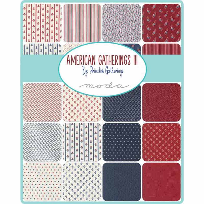 Forty-two 5in squares of the American Gatherings III by Primitive Gatherings for Moda. 100% printed cotton fabric.