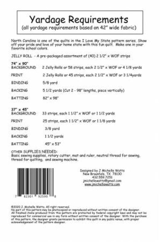 By J Michelle Watts Designs. A quilt in the I LOVE MY STATE series. Show off your pride and love of your home state with this scrappy quilt. Finished sizes - 37in x 45in and 74in x 90in.