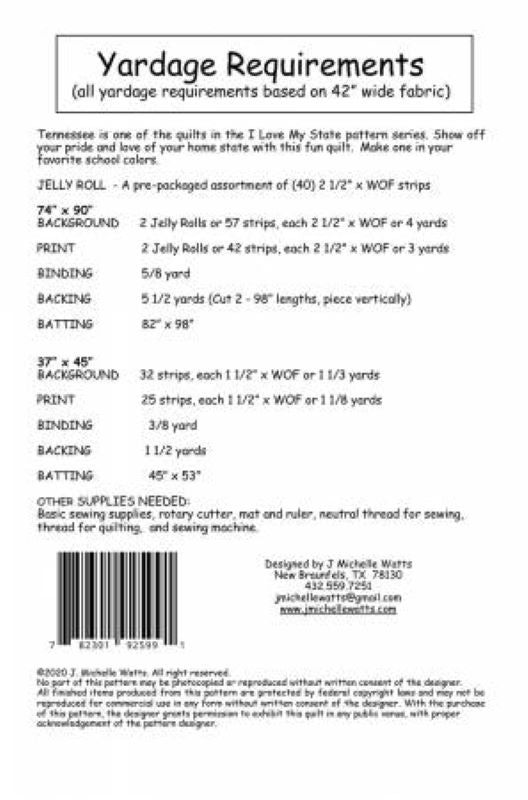 By J Michelle Watts Designs. A quilt in the I LOVE MY STATE series. Show off your pride and love of your home state with this scrappy quilt. Finished sizes - 37in x 45in and 74in x 90in.