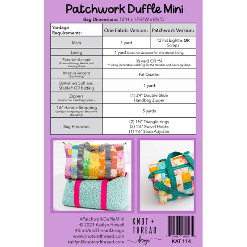 If you liked the wildly popular Patchwork Duffle you'll love to have the mini version of it! This Duffle features a patchwork exterior (or make it with your favorite fabric in a one fabric version) and large spacious opening. Perfect for all your travel needs! Size: 10in' H 17.5in W x 8.5in' D.