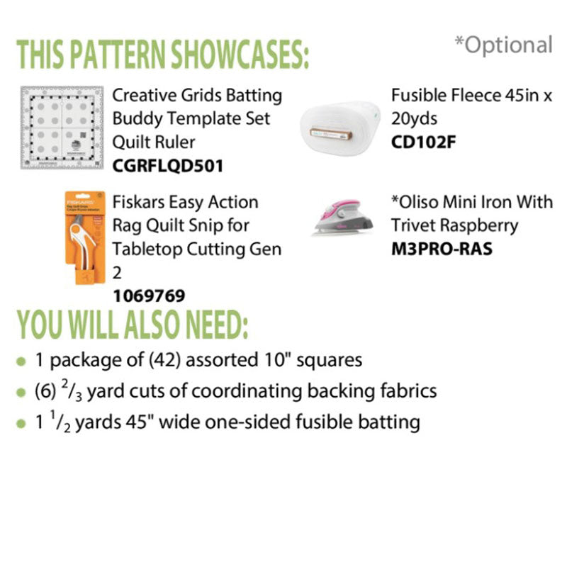 Rag quilts made it even easier! The Creative Grids Batting Buddy (CGRFLQD501) is your template for cutting, layering, and quilting to make this comfy and colorful rag quilt. You can continue to expand the quilt and make it as large as you want, or keep it small for a baby or as a lap quilt. Fi8nished size 45in X 45in.