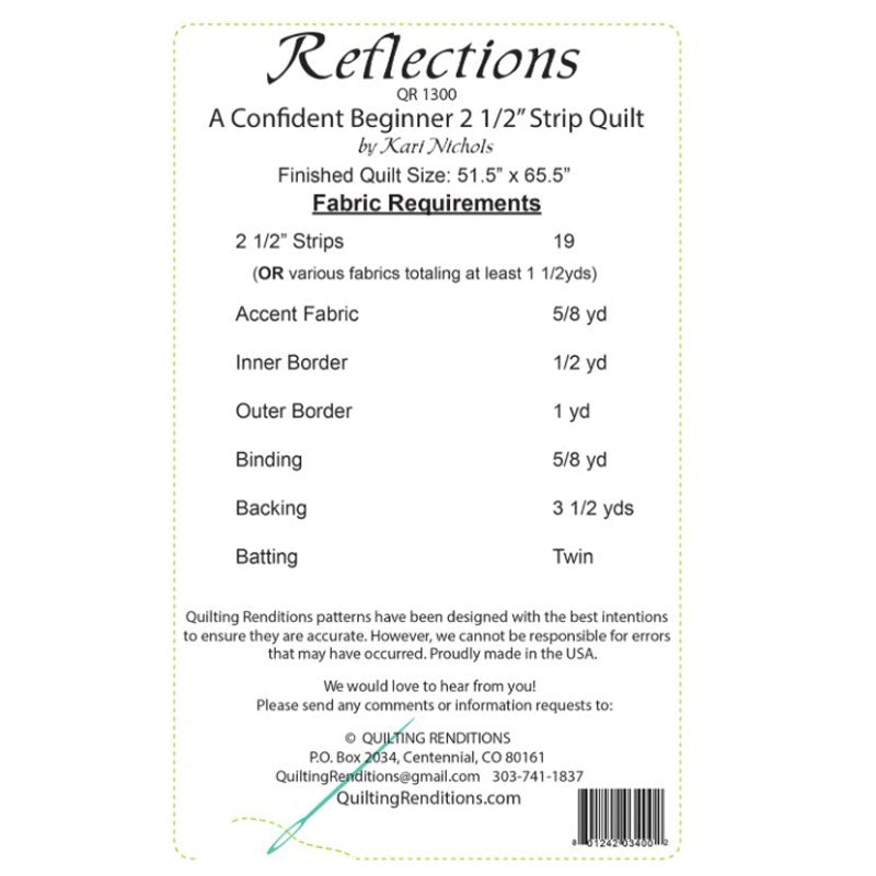 By Quilting Renditions. A sweet and simple 2 1/2" strip pattern. This confident beginner pattern makes a Throw size quilt. Finished Size: 51-1/2in x 65-1/2in.