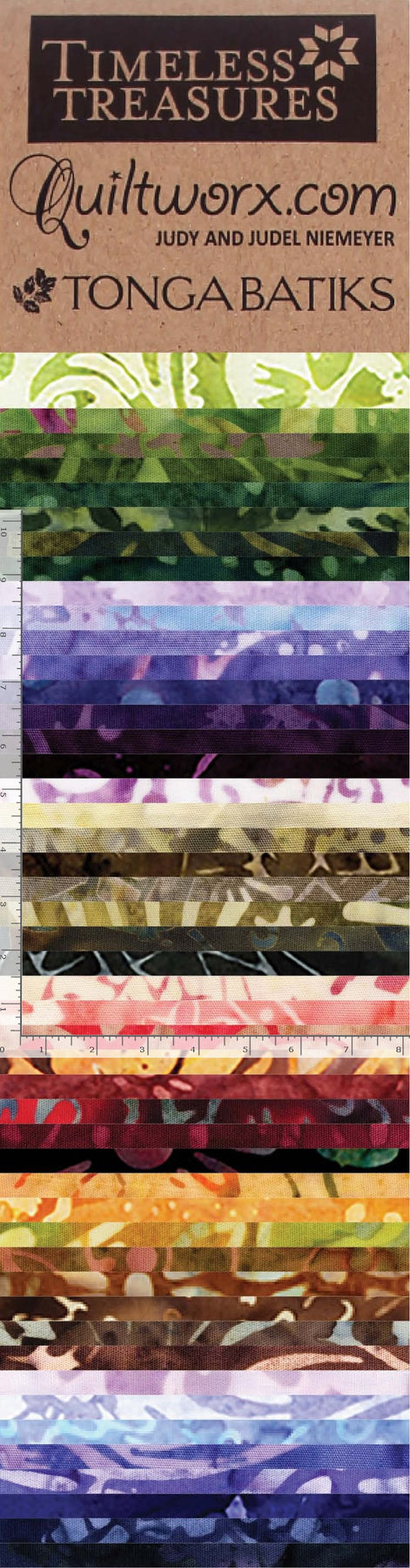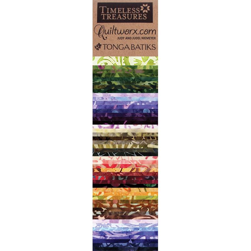 Forty-eight 2 1/2in batik strips picked by Judy Niemeyer for Timeless Treasures. 100% cotton batik fabric, 42-45in wide.